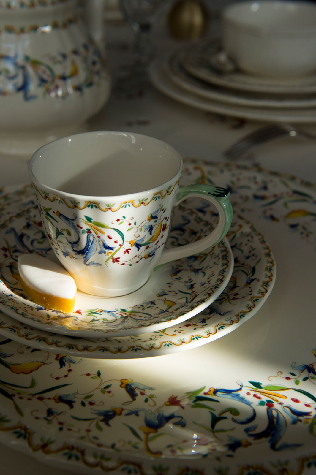 Ein Hauch italienische Renaissance umweht die Gien Toscana Serie. Inspiriert durch verschiedene Vorlagen aus dem Jahre 1875, wird dieses Keramikgeschirr von verschlungenen Blütenarabesken und Formen umspielt. Die warmen Farben sowie die schlichte Form machen die beliebte Gien Fayence zu einem zeitlosen Service.